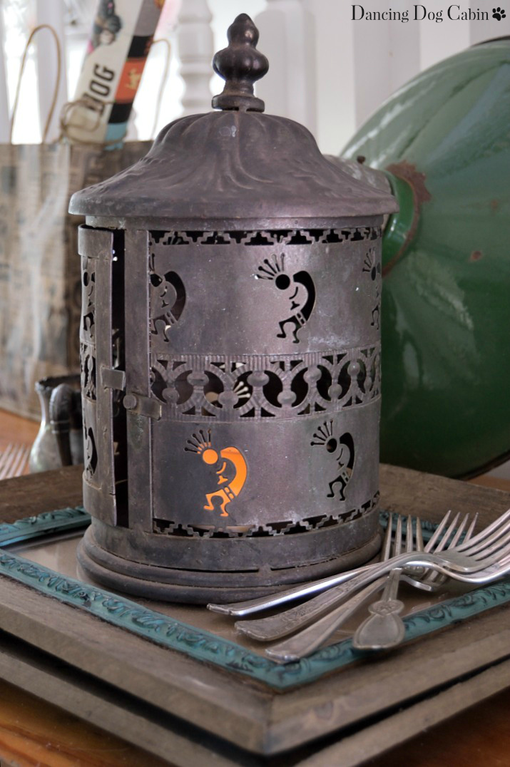 Everything in this part of the country is all about Southwestern style, including architecture, interior decorating, and food, and I've been asked several times if that is the style we will be using for the cabin. I'm not a fan of Southwestern style, however it has come a long way from what it was in the '80s. Nevertheless, this is not a style that will be necessarily emphasized in the cabin, although I'm not opposed to using a few 'Southwestern' elements, if I find something that appeals to me, such as this metal lantern. With its repeated Kokopelli figure, that icon of the Southwest (not to mention a deity important to several Southwestern Native American cultures), as well as its other subtle Southwestern patterns, it reflects the history and style of the area, but doesn't hit you over the head with an obvious stylistic statement. The picture frames on which the lantern sits are a lucky find at Micheal's (sale items)....I see a fun cabin-themed art project in my near future.