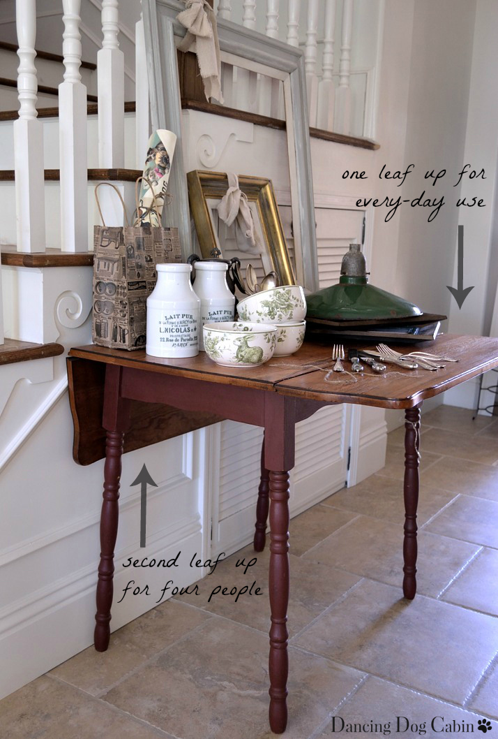 ....a small drop leaf table for the north facing windows. With one leaf up, my husband and I can sit here comfortably and have our meals and enjoy the view. With the second leaf up, the table can cozily seat four people (when we have guests, and when we aren't eating outside on our future deck)....