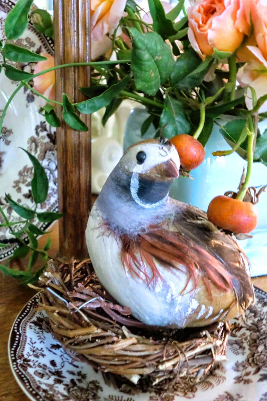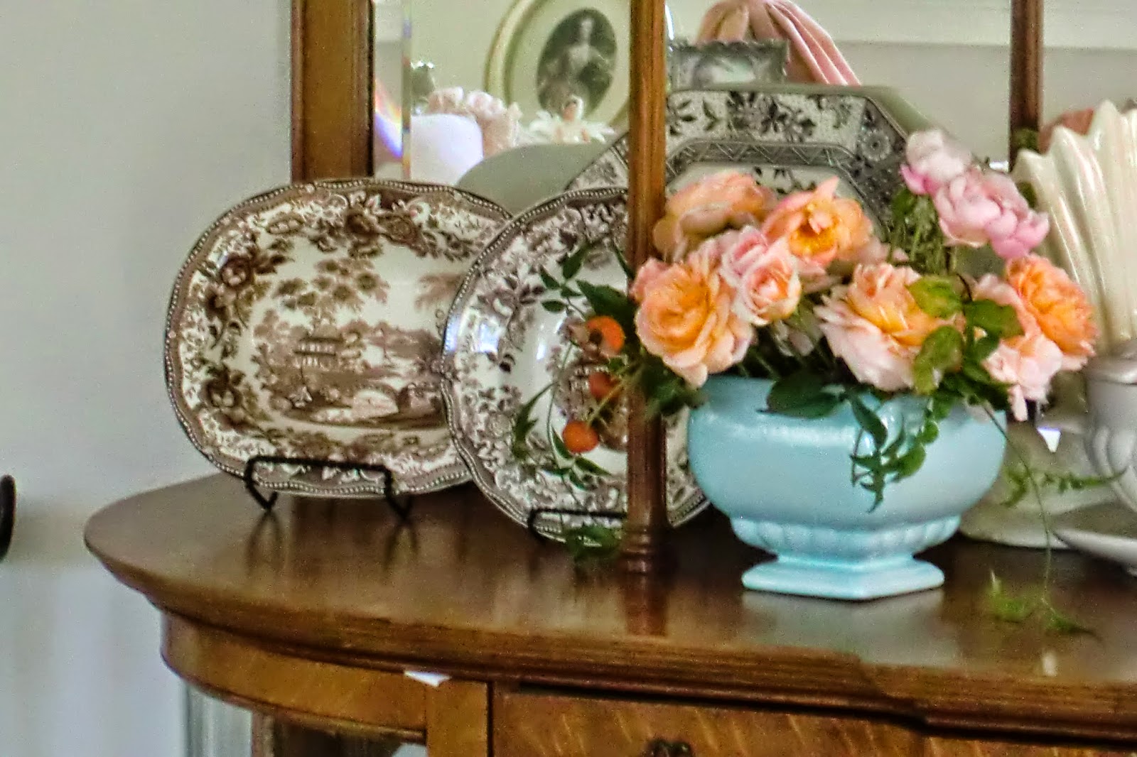 When decorating, I like to use patterns and motifs found in one object in other elements in the room. The fantastical birds and roses on this plate are repeated more or less on the love-seat slip cover...