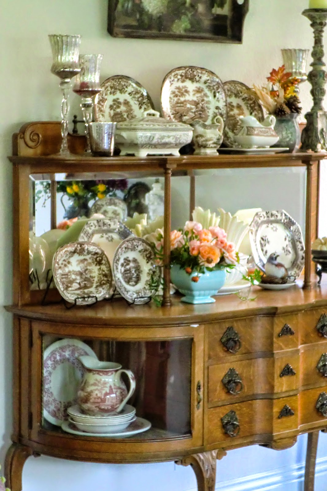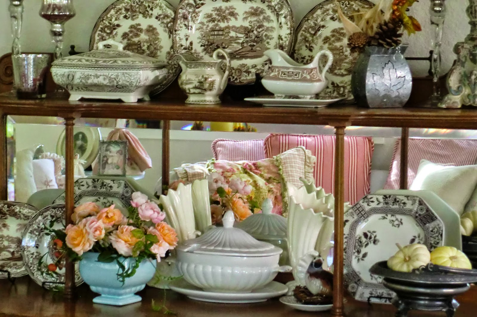 Until recently, I collected red transferware only. A few years ago, about the same time I decided it might be nice to have some brown transferware for fall, specifically for Thanksgiving, I stumbled upon a fantastic deal in an antique mall-- a huge collection of brown Tonquin Royal Staffordshire transferware drastically marked down. Talk about serendipity. I snapped it up and---voila!---had an instant collection with which to decorate (and eat off of) to my heart's content.