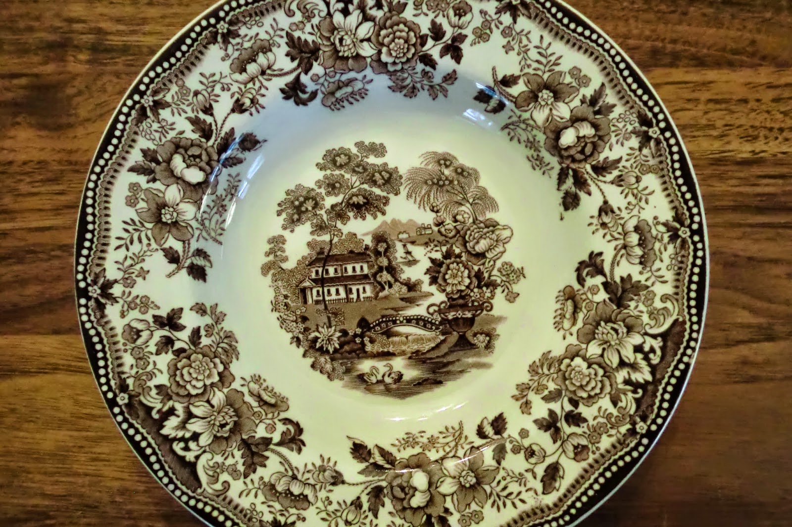 Since the colors in our house tend towards cranberry, raspberry reds and pinks, I avoid the red-brown transferware patterns and go for the darker, more neutral browns.....