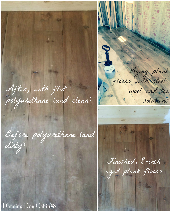 We wanted a more uniform color for the floors, so I used the same concentration of tea and steel-wool throughout the cabin. Both solutions sat for 2 days before use. The final result doesn't look particularly aged or weathered, but we both like it anyway. Its deep, rich brown color still shows all the knots and variations in the wood, as you can see in the before and after photos below.