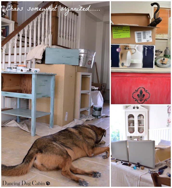 While all sorts of packages containing my Internet orders arrived daily, I busily spent whatever spare time I had left painting and distressing the kitchen cabinets, shopping local antique malls for the perfect side table/cabinet for converting to a bathroom vanity, painting and distressing it once I found it, trying to figure out how to make a galvanized steel tub work as a kitchen sink... and so on.. Here is a photo collage of this three-ring circus....