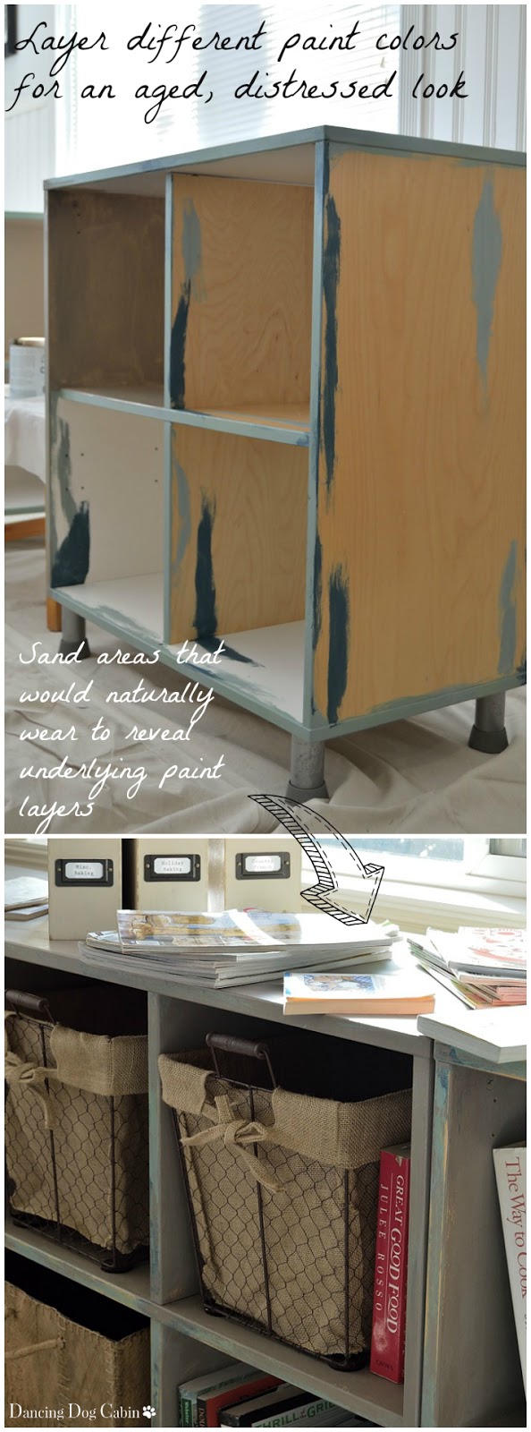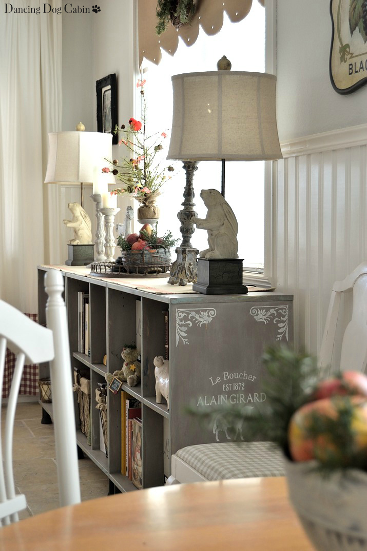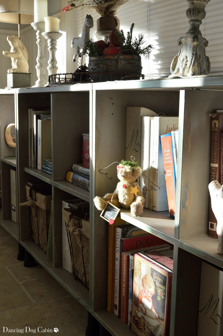 I chose these rustic, chicken wire and burlap bins because they fit in beautifully with the French Country-style of the bookcase. Again, using labels helps to keep track of everything.
