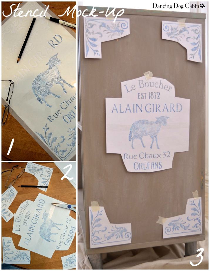 - I used Annie Sloan paint and clear wax, including 'Coco' lightened with 'Old White' for the overall color and 'Graphite' lightened with 'Old White' for the stencil pattern